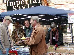 Mango-Aktion-Koordinator Alfred Weber (Naunheim) bietet dem Stammkunden Hans Herbold aus Volpertshausen Mango „Amalie“ als Kostprobe an. Mit vom TIKATOteam sind v.l.n.r. Rolf Schwarz, Hans-Jürgen Bernhardt und Ute Wilmers-Holm